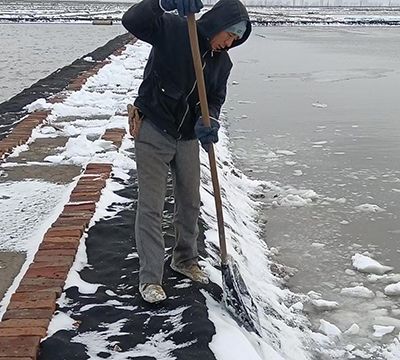 長蘆公司安排各單位清除門前、道路、生活區(qū)積雪。一線各單元及時清除塑苫積雪,用適當(dāng)濃度鹵水對趕鹵池進(jìn)行灌池化雪和串壕化雪。