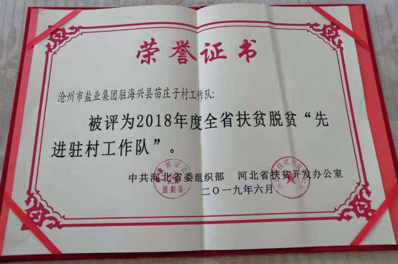 近日,滄州鹽業(yè)集團(tuán)駐苗莊子村工作隊,被中共河北省委組織部、河北省扶貧開發(fā)辦公室授予2018年度全省扶貧脫貧“先進(jìn)駐村工作隊”稱號。