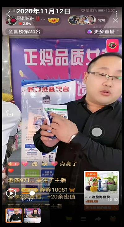 銀山食鹽公司銷(xiāo)售科副科長(zhǎng)郭帥負(fù)責(zé)相關(guān)業(yè)務(wù)聯(lián)系,并全程跟進(jìn)、及時(shí)溝通、全力配合快手平臺(tái)開(kāi)展工作。在“雙節(jié)”期間,曾一度因銷(xiāo)售火爆導(dǎo)致客服無(wú)法滿(mǎn)足售后服務(wù)。從直播帶貨至今,歷時(shí)20多天的時(shí)間里,共計(jì)銷(xiāo)售“滄鹽”牌小包裝食用鹽500余噸,其中海晶鹽107噸、精晶海鹽200噸,粉碎洗滌鹽200噸,開(kāi)創(chuàng)了線(xiàn)上主播帶貨銷(xiāo)售的先河,成為敢于在線(xiàn)上(快手平臺(tái))食鹽銷(xiāo)售第一個(gè)“吃螃蟹”的人。