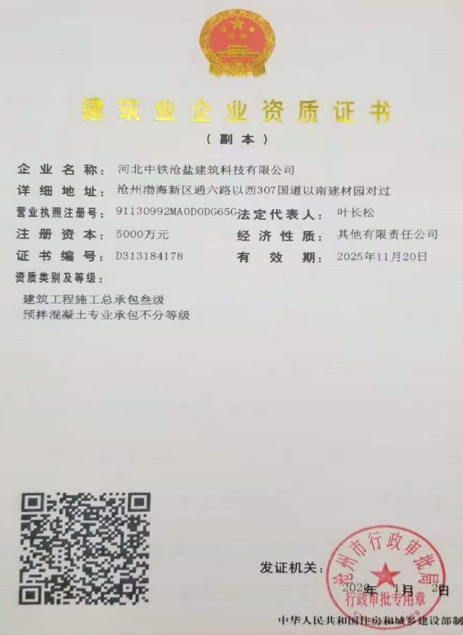 日前,河北中鐵滄鹽建筑科技有限公司經(jīng)過積極跑辦,如期取得了建筑工程施工總承包叁級(jí)和預(yù)拌混凝土專業(yè)承包不分等級(jí)兩個(gè)資質(zhì)。