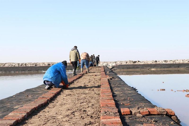為了做好灘田文明生產(chǎn),長蘆公司生產(chǎn)一線干部職工積極投入到灘內(nèi)護(hù)氈工作中。截至2021年2月2日,長蘆公司制鹽四五六工區(qū)共完成護(hù)灘埝修整、護(hù)氈13200米,完成灘內(nèi)池埝護(hù)氈12副灘,累計完成護(hù)氈面積達(dá)13.3萬平方米。
