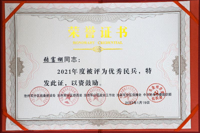 此外,公司武裝部長張富棚還被滄州軍分區(qū)授予“2021年度優(yōu)秀民兵”稱號。