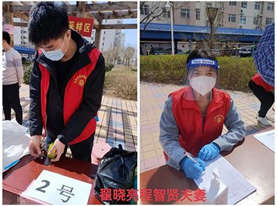 居家辦公的共產(chǎn)黨員陳玲、李國剛夫婦,主動(dòng)申請(qǐng)加入鹽場(chǎng)新區(qū)志愿服務(wù)隊(duì),兩人相互鼓勵(lì),并肩作戰(zhàn),積極配合醫(yī)務(wù)人員、社區(qū)工作人員做好信息核實(shí)登記、現(xiàn)場(chǎng)布置、發(fā)動(dòng)喊人、維持秩序、場(chǎng)地消毒、深夜照明等項(xiàng)工作,并主動(dòng)提供桌椅板凳以供檢測(cè)使用。