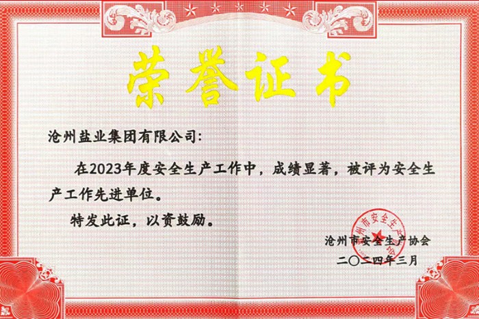 近日,滄州鹽業(yè)集團有限公司榮獲滄州市2023年度 “安全生產(chǎn)先進單位”榮譽稱號,這是公司連續(xù)第11年獲得該項榮譽。