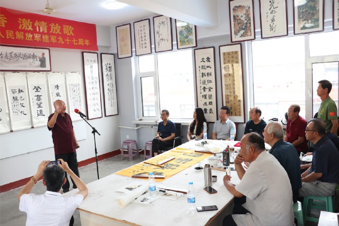 活動現(xiàn)場,充滿著濃郁的藝術(shù)氛圍。來自滄鹽集團書畫聯(lián)誼會的書法、繪畫愛好者和滄海紅色藝術(shù)團的嘉賓們以精湛的書畫、激昂的歌聲、深情的朗誦等藝術(shù)形式,抒發(fā)著對人民軍隊的熱愛與贊美。
