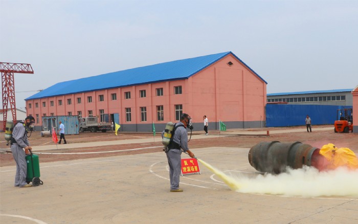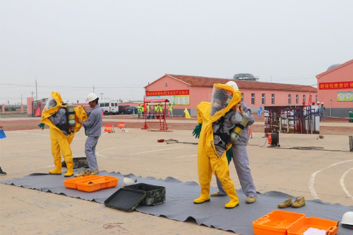 此次演練模擬了機(jī)械傷害、中暑、觸電、火災(zāi)、溴素燙傷、氯氣泄漏六個(gè)事故場(chǎng)景。演練開(kāi)始前,進(jìn)行了空呼機(jī)穿戴、全封閉防化服穿戴、空呼機(jī)穿戴30米跑、消防等技能比武活動(dòng)。