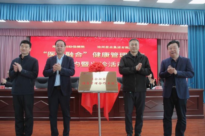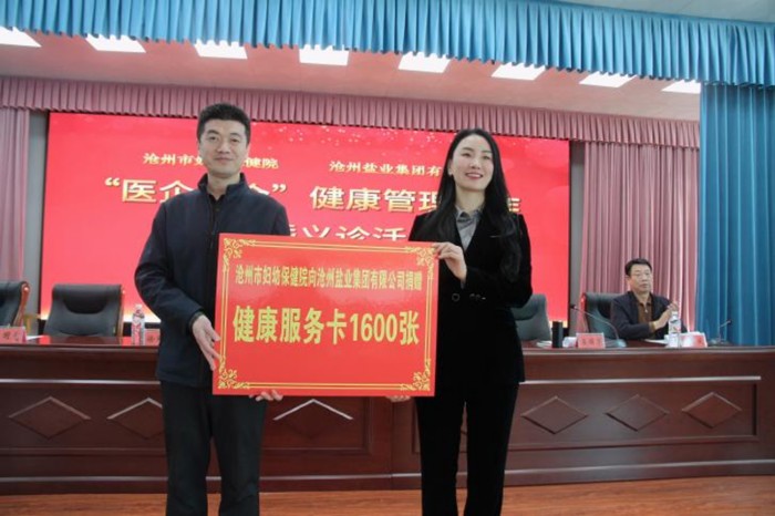 在參會人員的共同見證下,張立莊、徐聞鉑分別代表滄鹽集團、滄州市婦幼保健院簽訂了“醫(yī)企融合”健康管理合作意向書。張立莊、狄彬、徐聞鉑、崔國光共同為“醫(yī)企融合”健康管理合作單位揭牌。崔國芳代表滄鹽集團現(xiàn)場接受了滄州市婦幼保健院捐贈的1600余張健康服務卡。