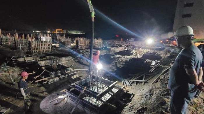8月3日晚,建筑工程有限公司在鳴岐化工項(xiàng)目的施工現(xiàn)場(chǎng)一片忙碌。為搶抓施工黃金期,避開日間高溫影響,同時(shí)趕在大雨來臨前推進(jìn)關(guān)鍵節(jié)點(diǎn),項(xiàng)目部科學(xué)統(tǒng)籌,利用晚間進(jìn)行施工作業(yè),集中澆筑罐區(qū)-罐組及泵棚基礎(chǔ)混凝土,總量達(dá)160立方。