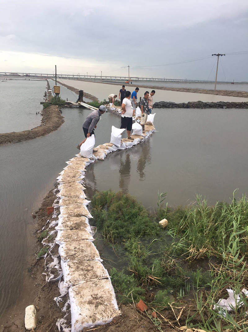 災(zāi)情刻不容緩。關(guān)鍵時(shí)刻,黨委書記、董事長(zhǎng)劉建軍,總經(jīng)理、防汛總指揮王銳冒雨親臨一線,指揮抗災(zāi)保產(chǎn)。面對(duì)險(xiǎn)情不斷的嚴(yán)峻形勢(shì),防汛辦公室關(guān)鍵時(shí)刻及時(shí)聯(lián)系供電公司、建筑工程公司,立即采取了調(diào)用挖掘機(jī)筑埝增高、搶險(xiǎn)疏通和拉閘停電禁止外排淡水的超常措施,為緩解排淡壓力,避免淡水漫灘贏得了寶貴時(shí)間。長(zhǎng)蘆鹽業(yè)公司不等不靠,斗志不減,班子成員親自帶隊(duì),組織全體突擊隊(duì)員進(jìn)行搶險(xiǎn)救災(zāi),在風(fēng)雨中砸樁、扛袋、護(hù)埝,嚴(yán)防死守,晝夜奮戰(zhàn)在抗災(zāi)一線,以堅(jiān)強(qiáng)的意志,不屈的精神,譜寫了又一曲抗災(zāi)保產(chǎn)的壯歌。各部(處)室、子公司也按照公司防汛指揮部的統(tǒng)一部署,緊緊圍繞防汛大局,全力做好保障工作。